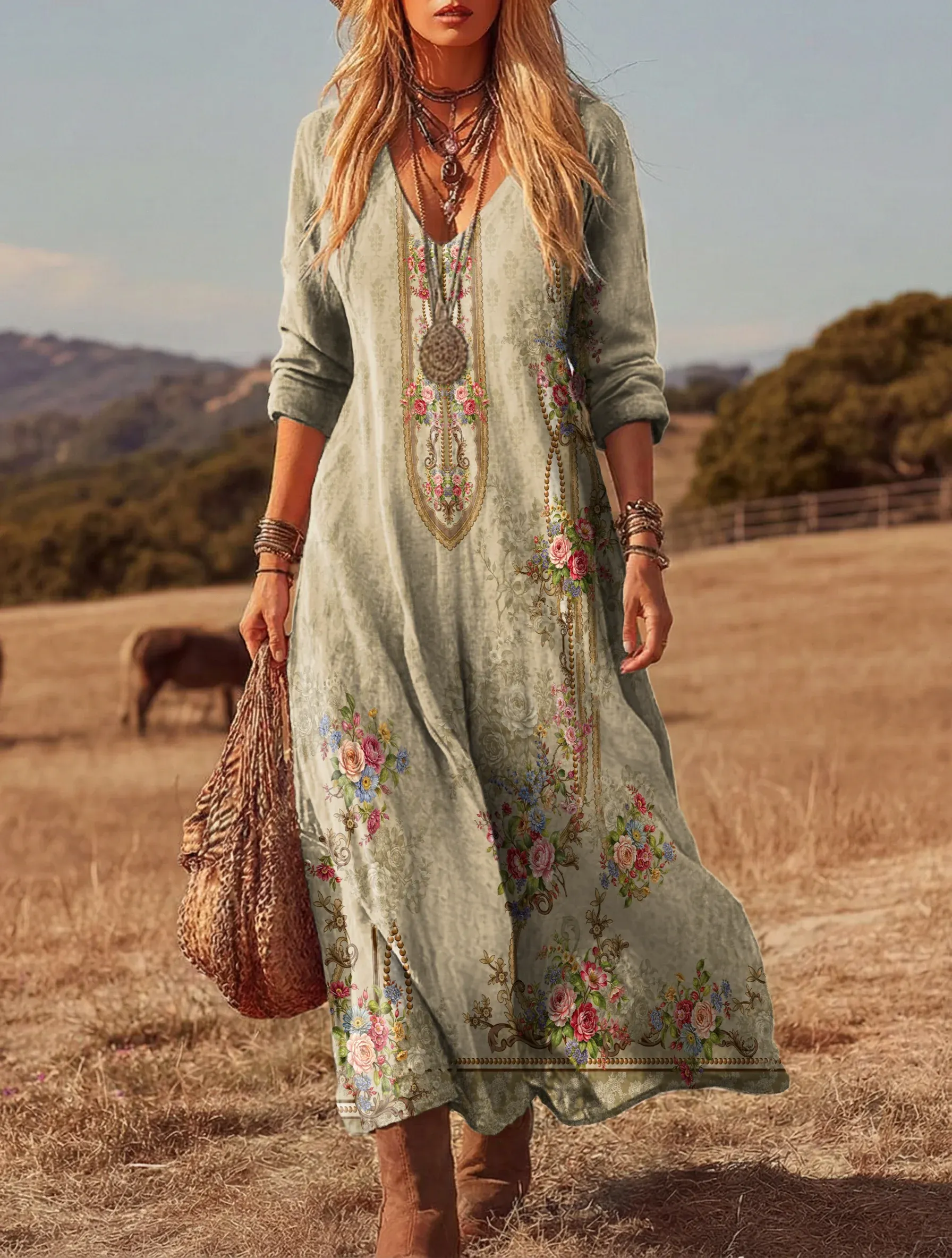 Damskie vintage bawełniane sukienki z nadrukiem Styl casualowy • Dekolt w kształcie litery V • Długie rękawy • Praktyczne kieszenie