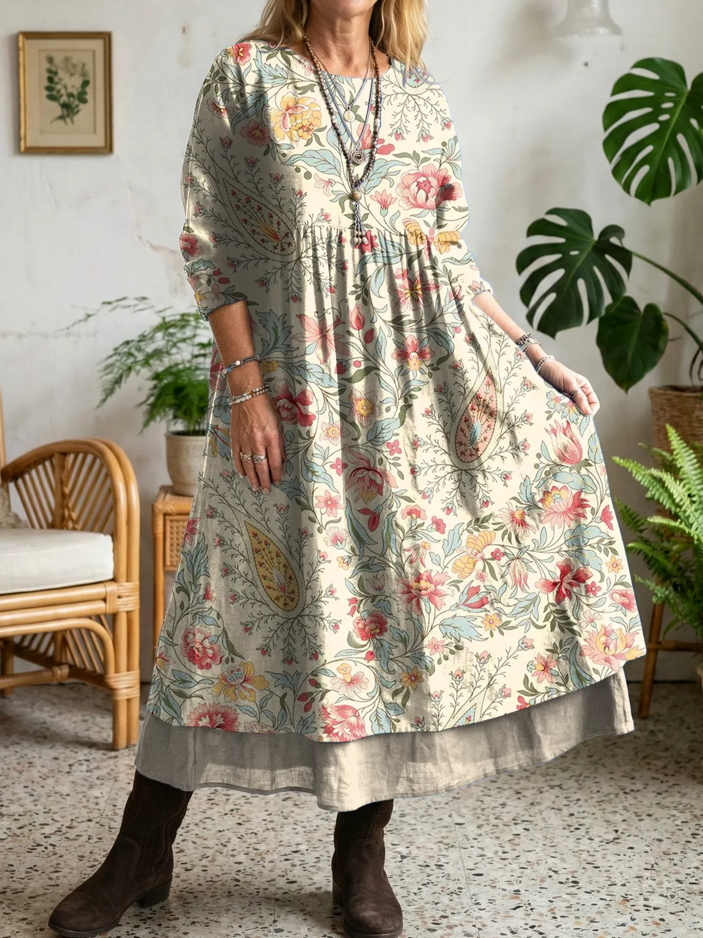 Bawełniano-lniana sukienka z okrągłym dekoltem i nadrukiem 🌿 Naturalna elegancja na co dzień