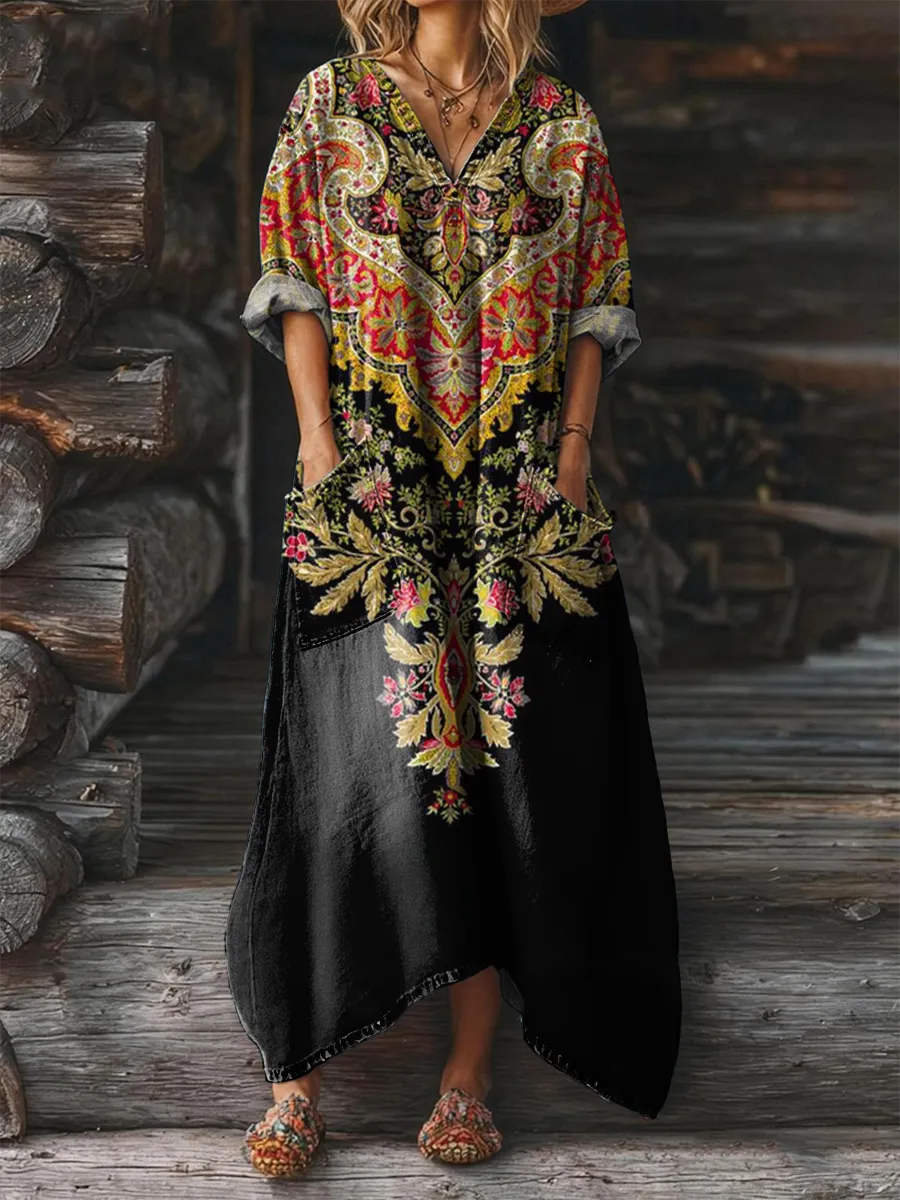 Damskie vintage bawełniane sukienki z nadrukiem Styl casualowy • Dekolt w kształcie litery V • Długie rękawy • Praktyczne kieszenie
