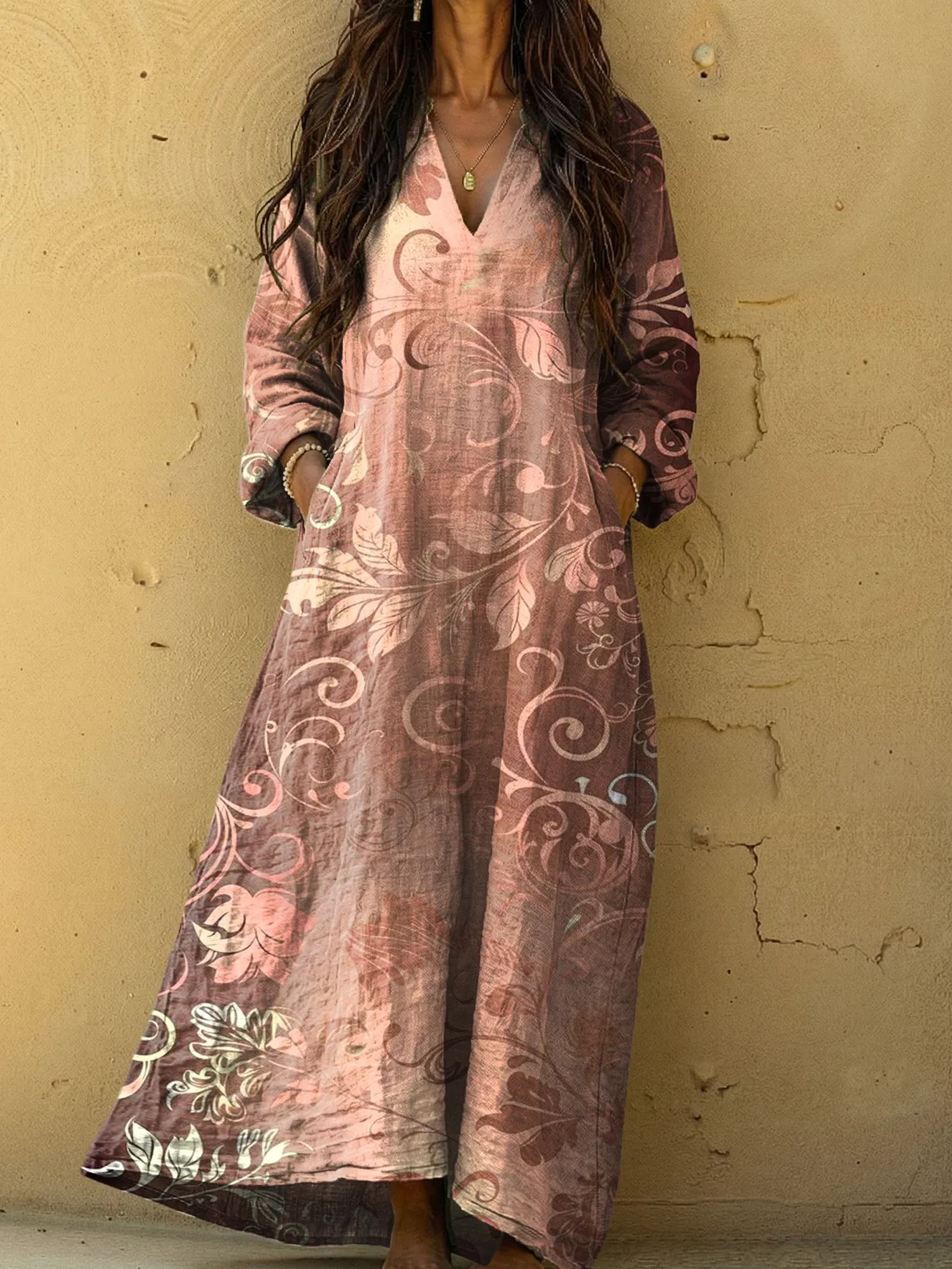 Dekolt w kształcie litery V pięknie podkreśla szyję i dodaje sukience kobiecego uroku. Długość do połowy łydki zapewnia lekkość i swobodę ruchów.